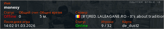 Играет на Counter Strike 1.6 сервере. Страна: РумынияПервый раз замечен 14:00 01.03.2026