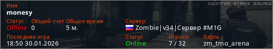 Играет на Counter Strike Source сервере. Страна: РоссияПервый раз замечен 17:46 30.01.2026