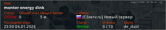 Играет на Counter Strike 1.6 сервере. Страна: РоссияПервый раз замечен 23:33 04.01.2026