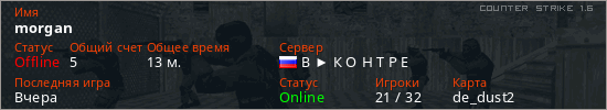 Играет на Counter Strike 1.6 сервере. Страна: РоссияПервый раз замечен 00:46 27.03.2026