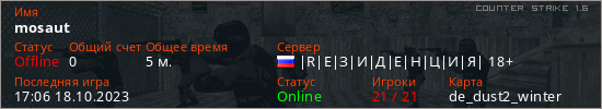 Играет на Counter Strike 1.6 сервере. Страна: РоссияПервый раз замечен 16:02 18.10.2023