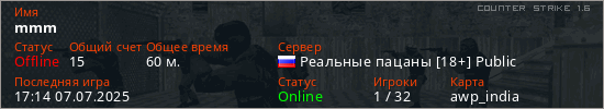 Последний раз был в сети 17:14 07.07.2025 Игрок с таким ником замечен на 42 серверах