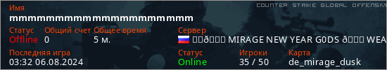 Играет на Counter Strike Global Offensive сервере. Страна: РоссияПервый раз замечен 03:17 06.08.2024
