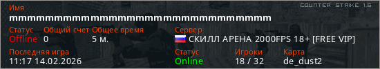 Играет на Counter Strike 1.6 сервере. Страна: РоссияПервый раз замечен 11:14 14.02.2026