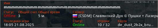 Играет на Counter Strike 1.6 сервере. Страна: РоссияПервый раз замечен 18:03 21.08.2025