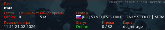 Играет на Counter Strike Global Offensive сервере. Страна: РоссияПервый раз замечен 11:47 21.02.2026
