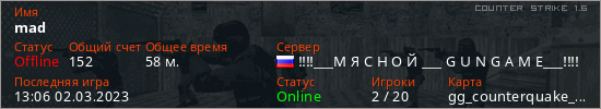 Играет на Counter Strike 1.6 сервере. Страна: РоссияПервый раз замечен 12:11 02.03.2023