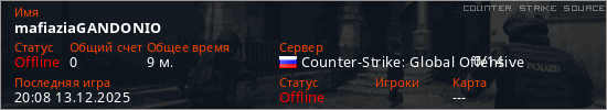 Играет на Counter Strike Source сервере. Страна: РоссияПервый раз замечен 12:13 13.12.2025