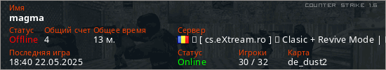 Играет на Counter Strike 1.6 сервере. Страна: РумынияПервый раз замечен 18:40 04.01.2025