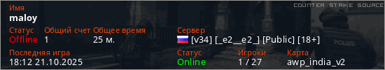 Играет на Counter Strike Source сервере. Страна: РоссияПервый раз замечен 19:06 19.11.2023