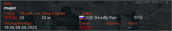 Играет на Counter Strike 1.6 сервере. Страна: РоссияПервый раз замечен 19:30 11.03.2023