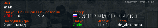 Играет на Counter Strike 1.6 сервере. Страна: РоссияПервый раз замечен 12:12 05.02.2026