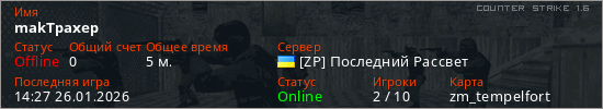 Играет на Counter Strike 1.6 сервере. Страна: УкраинаПервый раз замечен 14:17 26.01.2026