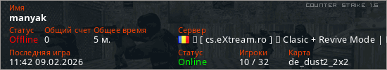Играет на Counter Strike 1.6 сервере. Страна: РумынияПервый раз замечен 11:40 09.02.2026