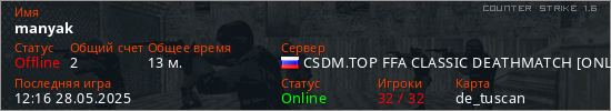 Последний раз был в сети 12:16 28.05.2025 Игрок с таким ником замечен на 13 серверах