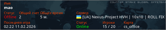 Играет на Counter Strike Global Offensive сервере. Страна: УкраинаПервый раз замечен 02:18 11.02.2026