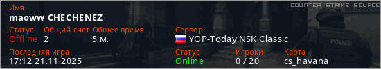 Играет на Counter Strike Source сервере. Страна: РоссияПервый раз замечен 16:16 21.11.2025