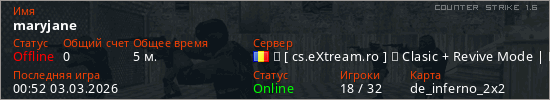 Играет на Counter Strike 1.6 сервере. Страна: РумынияПервый раз замечен 00:49 03.03.2026