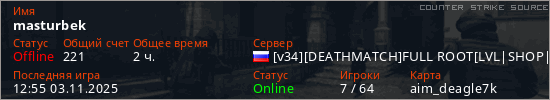 Играет на Counter Strike Source сервере. Страна: РоссияПервый раз замечен 18:41 13.09.2025