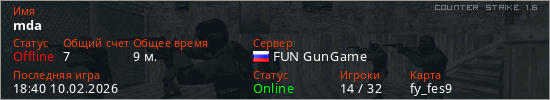 Играет на Counter Strike 1.6 сервере. Страна: РоссияПервый раз замечен 17:04 10.02.2026