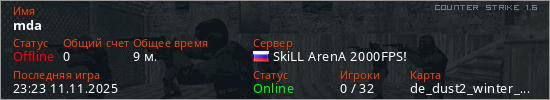 Играет на Counter Strike 1.6 сервере. Страна: РоссияПервый раз замечен 00:08 11.07.2024