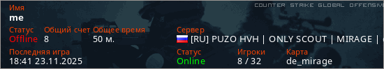 Играет на Counter Strike Global Offensive сервере. Страна: РоссияПервый раз замечен 10:44 21.08.2025