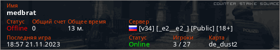 Играет на Counter Strike Source сервере. Страна: РоссияПервый раз замечен 14:20 08.11.2023