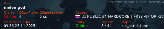 Играет на Counter Strike Global Offensive сервере. Страна: РоссияПервый раз замечен 08:30 25.11.2025