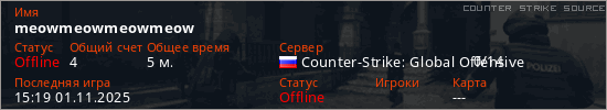 Играет на Counter Strike Source сервере. Страна: РоссияПервый раз замечен 15:09 01.11.2025