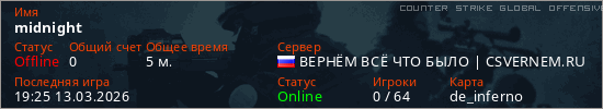 Играет на Counter Strike Global Offensive сервере. Страна: РоссияПервый раз замечен 19:19 13.03.2026