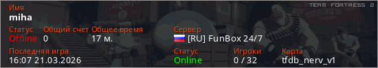 Играет на Team Fortress 2 сервере. Страна: РоссияПервый раз замечен 13:36 21.03.2026