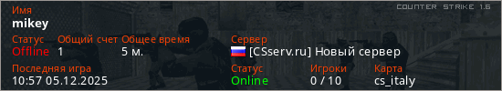 Играет на Counter Strike 1.6 сервере. Страна: РоссияПервый раз замечен 10:49 05.12.2025