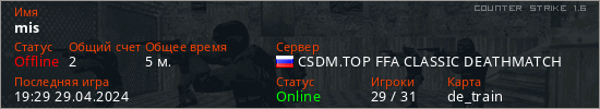 Играет на Counter Strike 1.6 сервере. Страна: РоссияПервый раз замечен 19:21 29.04.2024