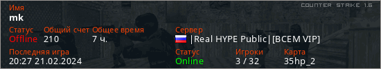 Играет на Counter Strike 1.6 сервере. Страна: РоссияПервый раз замечен 14:34 11.12.2023