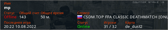Играет на Counter Strike 1.6 сервере. Страна: РоссияПервый раз замечен 20:33 14.11.2020