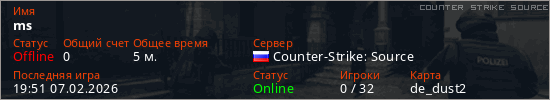 Играет на Counter Strike Source сервере. Страна: РоссияПервый раз замечен 19:49 07.02.2026