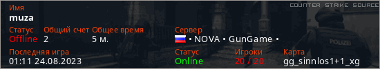 Играет на Counter Strike Source сервере. Страна: РоссияПервый раз замечен 01:07 24.08.2023