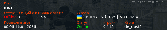 Играет на Counter Strike 1.6 сервере. Страна: УкраинаПервый раз замечен 23:55 15.04.2026