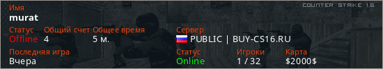 Играет на Counter Strike 1.6 сервере. Страна: РоссияПервый раз замечен 22:52 22.03.2026