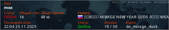 Играет на Counter Strike Global Offensive сервере. Страна: РоссияПервый раз замечен 18:51 23.11.2025