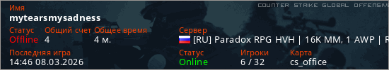 Играет на Counter Strike Global Offensive сервере. Страна: РоссияПервый раз замечен 14:44 08.03.2026