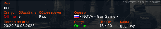Играет на Counter Strike Source сервере. Страна: РоссияПервый раз замечен 23:18 02.09.2022