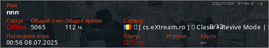 Играет на Counter Strike 1.6 сервере. Страна: РумынияПервый раз замечен 16:41 09.01.2025