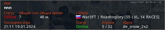Играет на Counter Strike 1.6 сервере. Страна: РоссияПервый раз замечен 18:12 22.01.2021