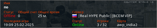 Играет на Counter Strike 1.6 сервере. Страна: РоссияПервый раз замечен 13:03 18.11.2024