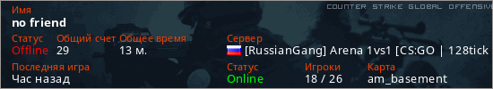 Играет на Counter Strike Global Offensive сервере. Страна: РоссияПервый раз замечен 12:29 26.03.2026