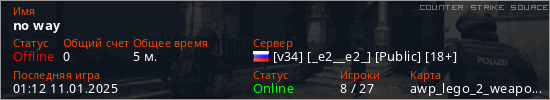Играет на Counter Strike Source сервере. Страна: РоссияПервый раз замечен 00:40 11.01.2025