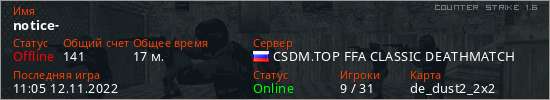 Играет на Counter Strike 1.6 сервере. Страна: РоссияПервый раз замечен 10:51 12.11.2022