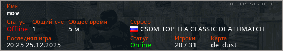 Играет на Counter Strike 1.6 сервере. Страна: РоссияПервый раз замечен 20:23 25.12.2025
