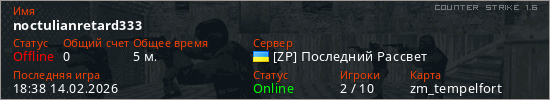 Играет на Counter Strike 1.6 сервере. Страна: УкраинаПервый раз замечен 18:36 14.02.2026
